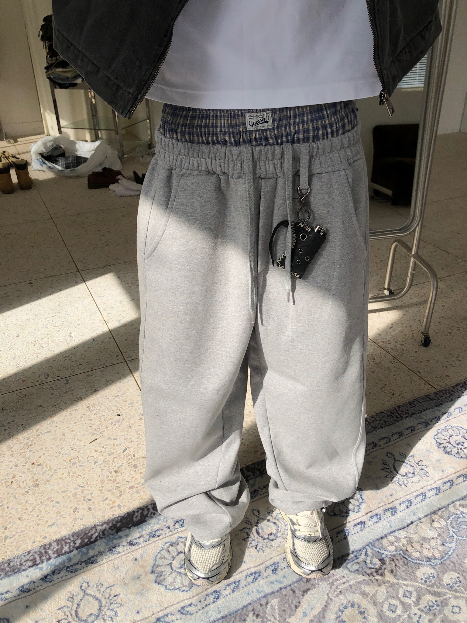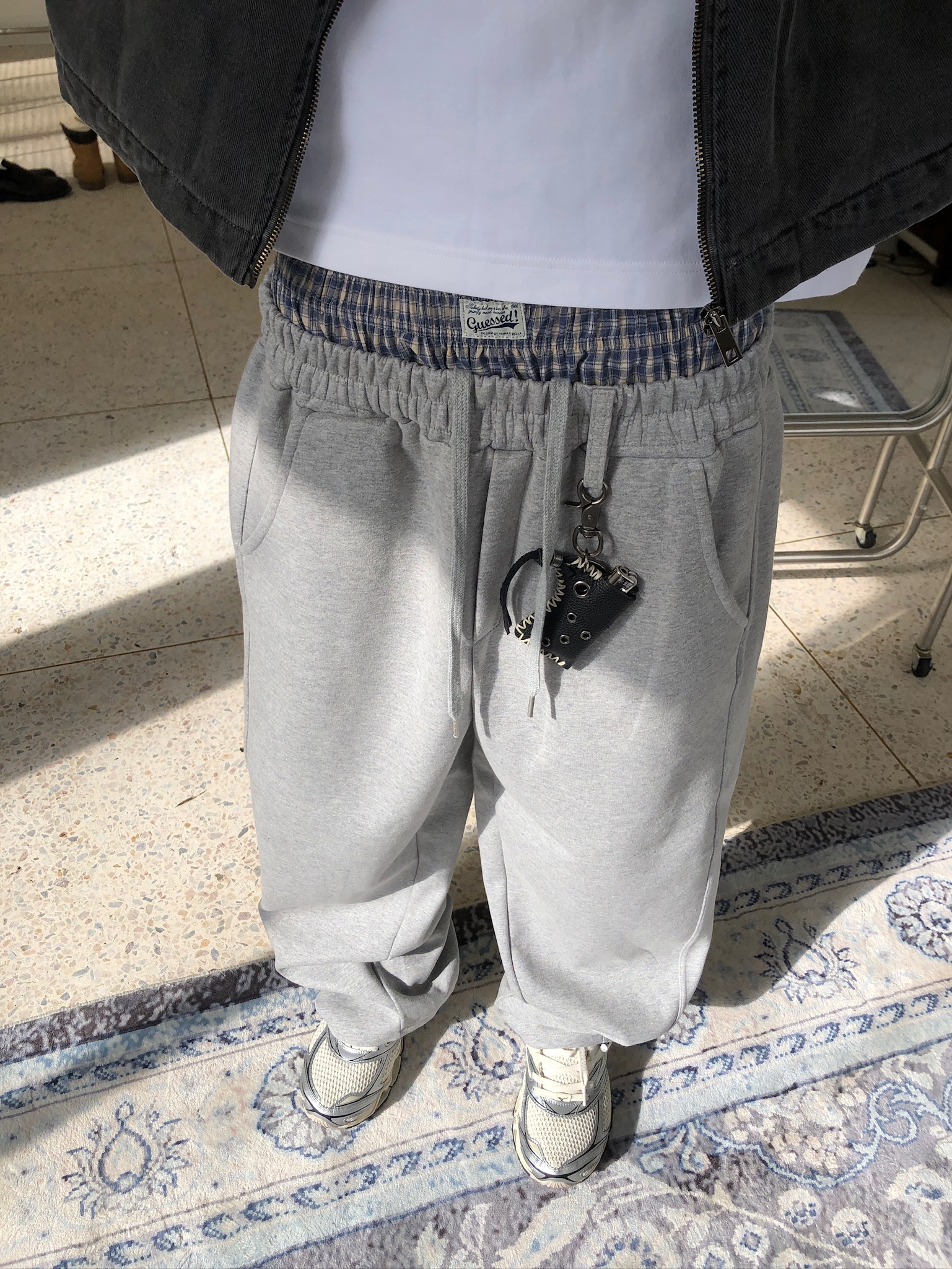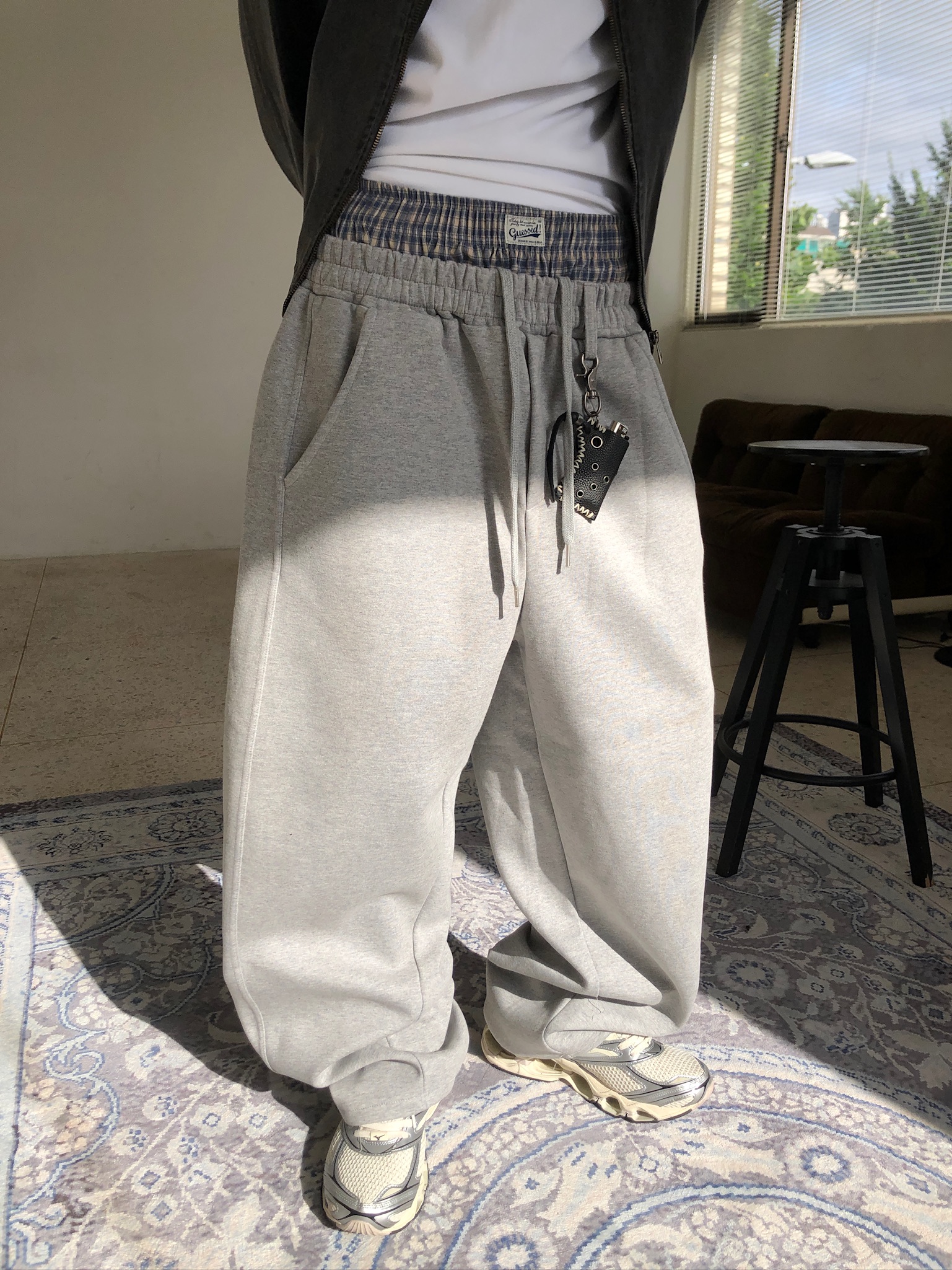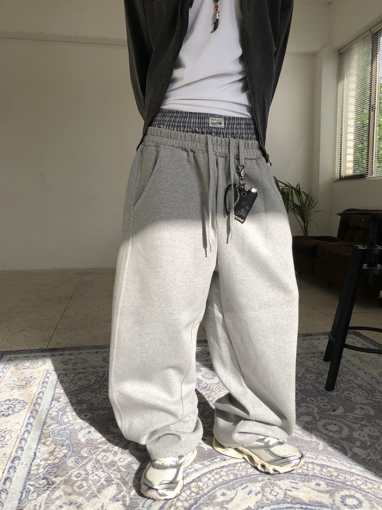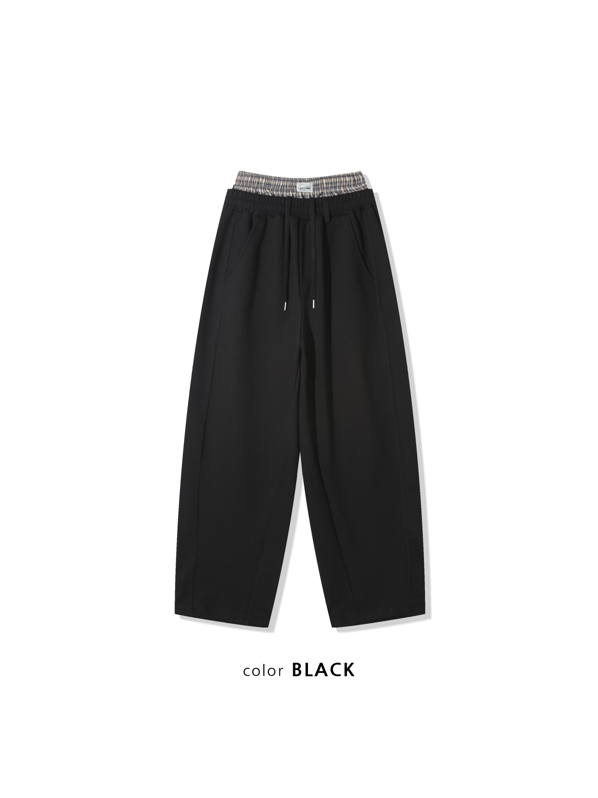歐洲街頭潮流 格紋層疊 寬版 休閒 落地褲 - 2C